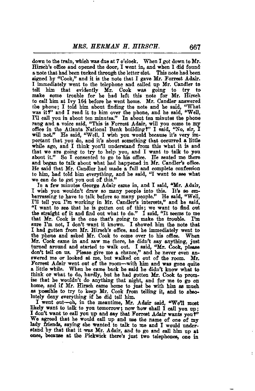 In a few minutes, George Adair came in, and I said, "Mr. Adair, I wish you wouldn't draw so many people into this. It's so embarrassing to have to talk before so many people." He said, "Well, I'll tell you I'm working in Mr. Candler's interests," and he said, "I want to see that he is gotten out of this; we want to find out the straight of it and find out what to do." I said, "It seems to me that Mr. Cook is the one that's going to make the trouble. I'm sure I'm not, I don't want it known." I showed him the note that I had gotten from Mr. Hirsch's office, and he immediately went to the phone and asked Mr. Cook to come over to his office. When Mr. Cook came in and saw me there, he didn't say anything, just turned around and started to walk out. I said, "Mr. Cook, please don't tell on us. Please give me a chance," and he never even answered me or looked at me, but walked on out of the room. Mr. Forrest Adair went out of the room with him and was gone quite a little while. When he came back, he said he didn't know what to think or what to do, hardly, but he had gotten Mr. Cook to promise that he wouldn't do anything that night, and for me to go on home, and if Mr. Hirsch came home to just be with him as much as possible to try to keep Mr. Cook from telling it, and to absolutely deny everything if he did tell him.