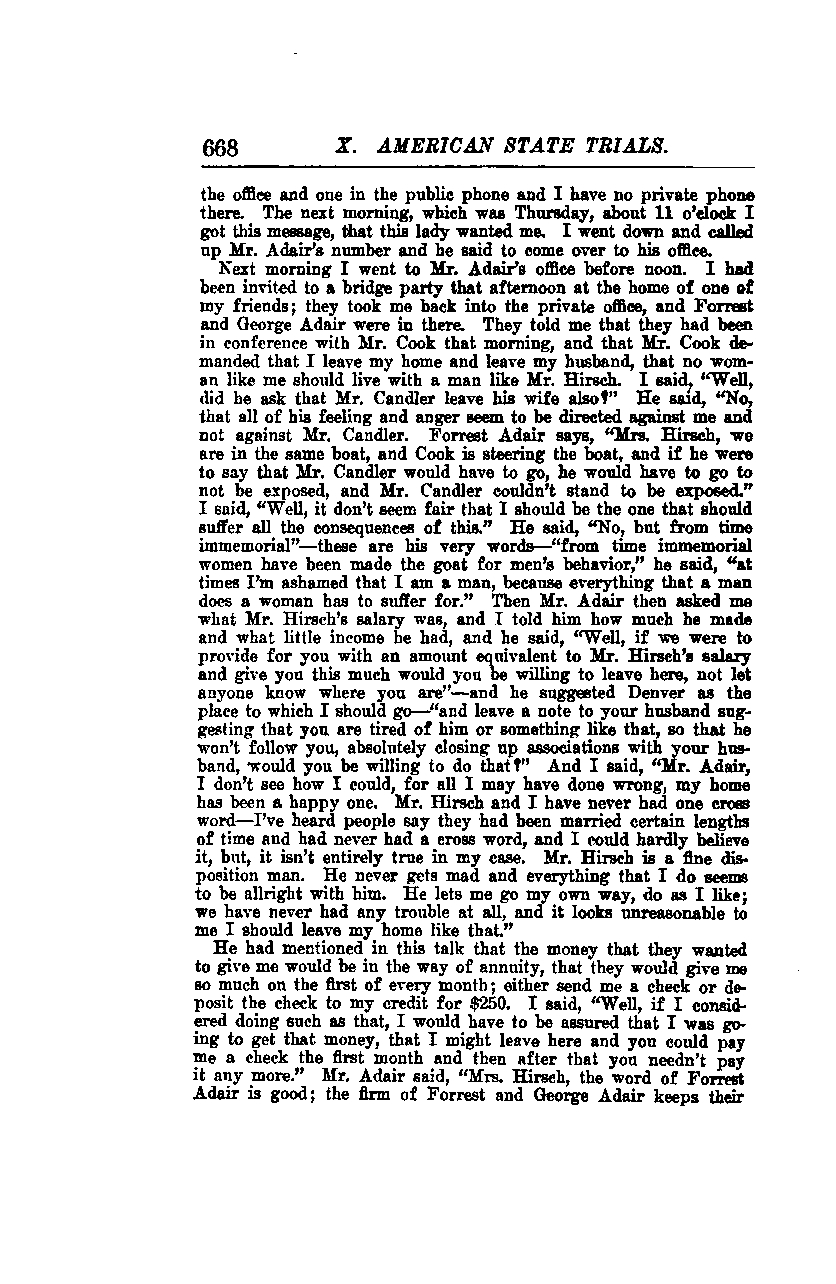 The next morning, I went to Mr. Adair’s office before noon. I had been invited to a bridge party that afternoon at a friend's home. They took me back into the private office, where Forrest and George Adair were present. They informed me that they had been in conference with Mr. Cook that morning. Mr. Cook demanded that I leave my home and my husband, stating that no woman like me should live with a man like Mr. Hirsch. I asked, “Well, did he ask that Mr. Candler leave his wife also?” He said, “No, all of his feelings and anger seem to be directed against you and not against Mr. Candler.”
