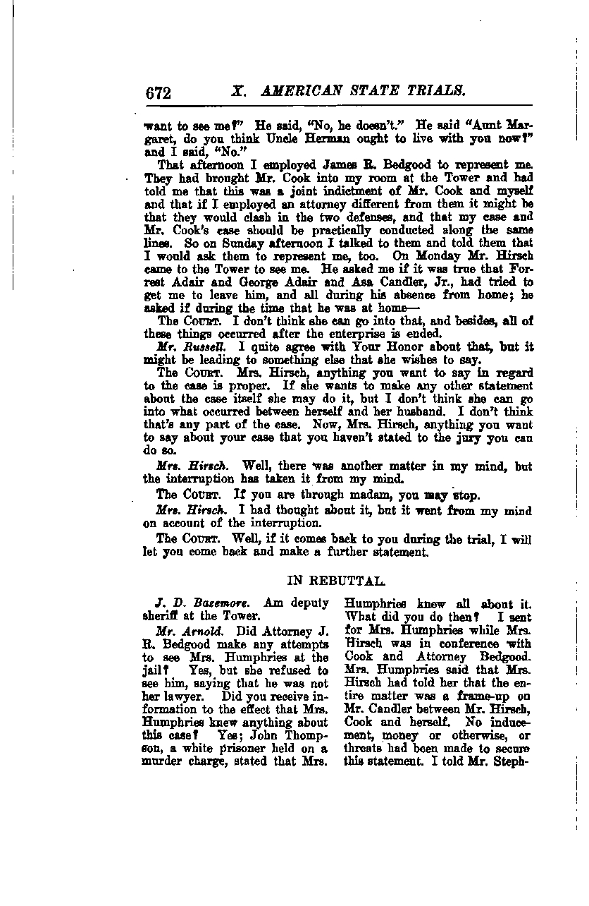 Mr. Arnold: Did Attorney J. B. Bedgood make any attempts to see Mrs. Humphries at the jail? Yes, but she refused to see him, saying that he was not her lawyer. Did you receive information to the effect that Mrs. Humphries knew anything about this case? Yes; John Thompson, a white prisoner held on a murder charge, stated that Mrs. Humphries said that Mrs. Hirsch had told her that the entire matter was a frame-up on Mr. Candler between Mr. Hirsch, Cook, and herself. No inducement, money or otherwise, or threats had been made to secure this statement. I told Mr. Steph—