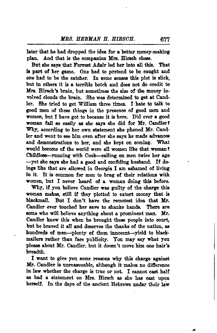 I want to give you some reasons why this charge against Mr. Candler is unreasonable, although it makes no difference in law whether the charge is true or not. I cannot cast half as bad a statement on Mrs. Hirsch as she has cast upon herself. In the days of the ancient Hebrews under their law...