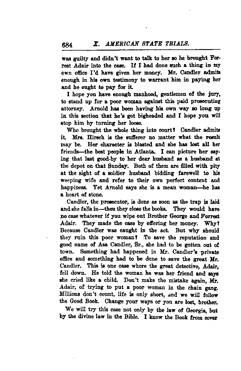 Candler, the prosecutor, is done as soon as the trap is laid and she falls in—then they close the books. They would have no case whatsoever if you remove Brother George and Forrest Adair. They made the case by offering her money. Why? Because Candler was caught in the act. But why should they ruin this poor woman? To save the reputation and good name of Asa Candler, Sr., she had to be gotten out of town. Something had happened in Mr. Candler's private office, and something had to be done to save the great Mr. Candler. This is one case where the great detective, Adair, failed. He told the woman he was her friend and says she cried like a child. Don't make the mistake again, Mr. Adair, of trying to put a poor woman in the chain gang. Millions don't count; life is short, and we will follow the Good Book. Change your ways, or you are lost, brother.