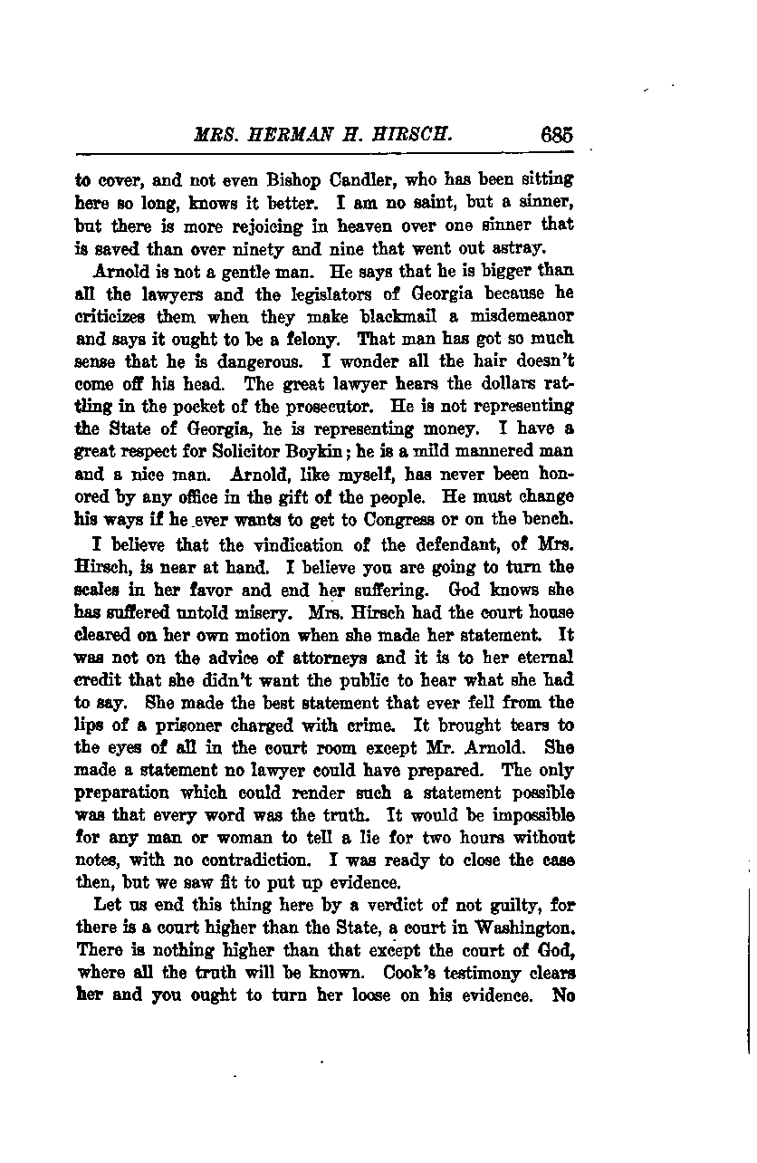 I believe that the vindication of the defendant, Mrs. Hirsch, is near at hand. I believe you are going to turn the scales in her favor and end her suffering. God knows she has suffered untold misery. Mrs. Hirsch had the courthouse cleared on her own motion when she made her statement. It was not on the advice of attorneys, and it is to her eternal credit that she didn’t want the public to hear what she had to say. She made the best statement that ever fell from the lips of a prisoner charged with a crime. It brought tears to the eyes of all in the courtroom except Mr. Arnold. She made a statement no lawyer could have prepared. The only preparation which could render such a statement possible was that every word was the truth. It would be impossible for any man or woman to tell a lie for two hours without notes, with no contradiction. I was ready to close the case then, but we saw fit to put up evidence.