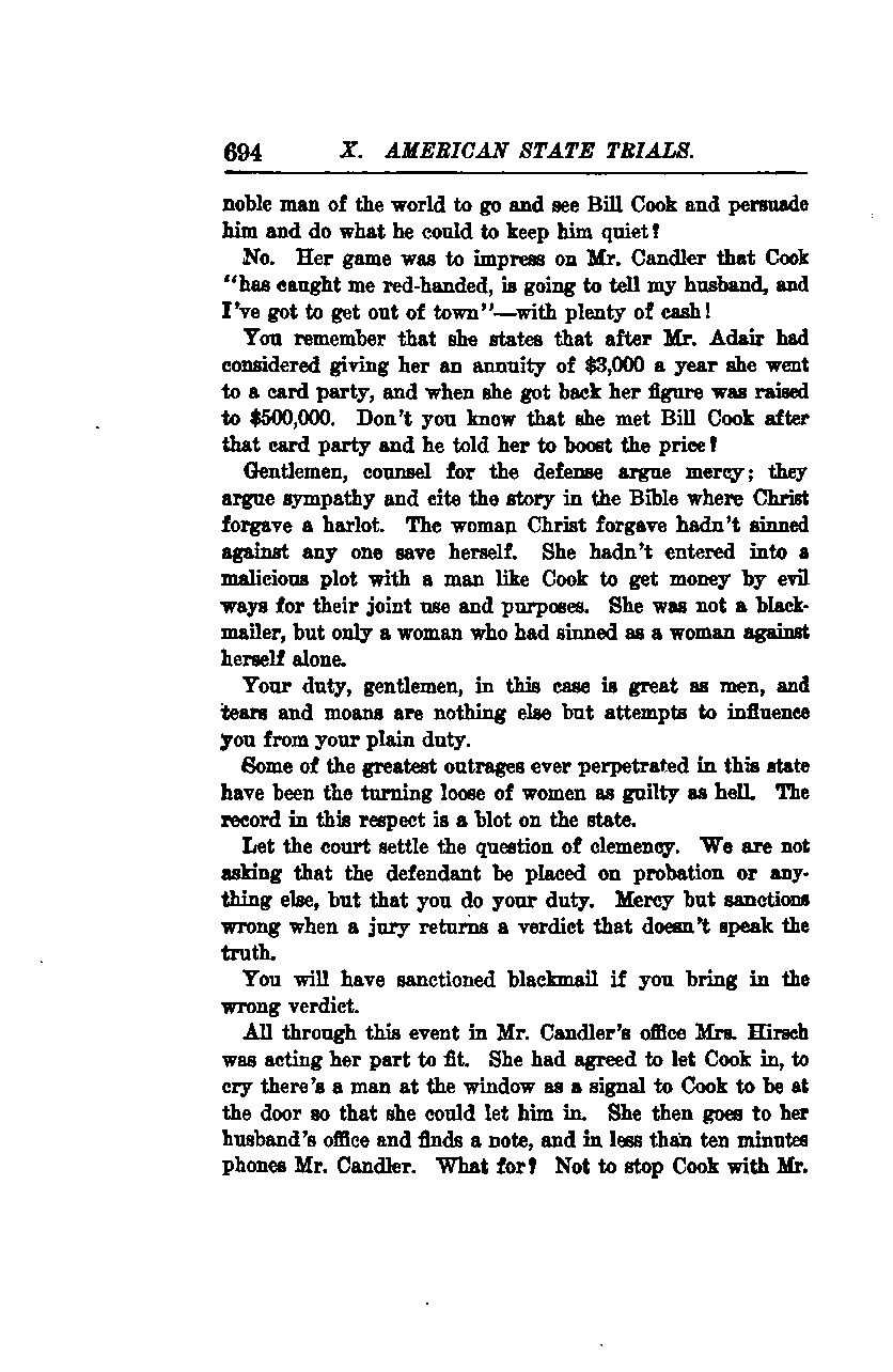 Gentlemen, counsel for the defense argue for mercy; they argue sympathy and cite the story in the Bible where Christ forgave a harlot. The woman Christ forgave hadn’t sinned against anyone save herself. She hadn’t entered into a malicious plot with a man like Cook to get money by evil ways for their joint use and purposes. She was not a blackmailer, but only a woman who had sinned as a woman against herself alone.