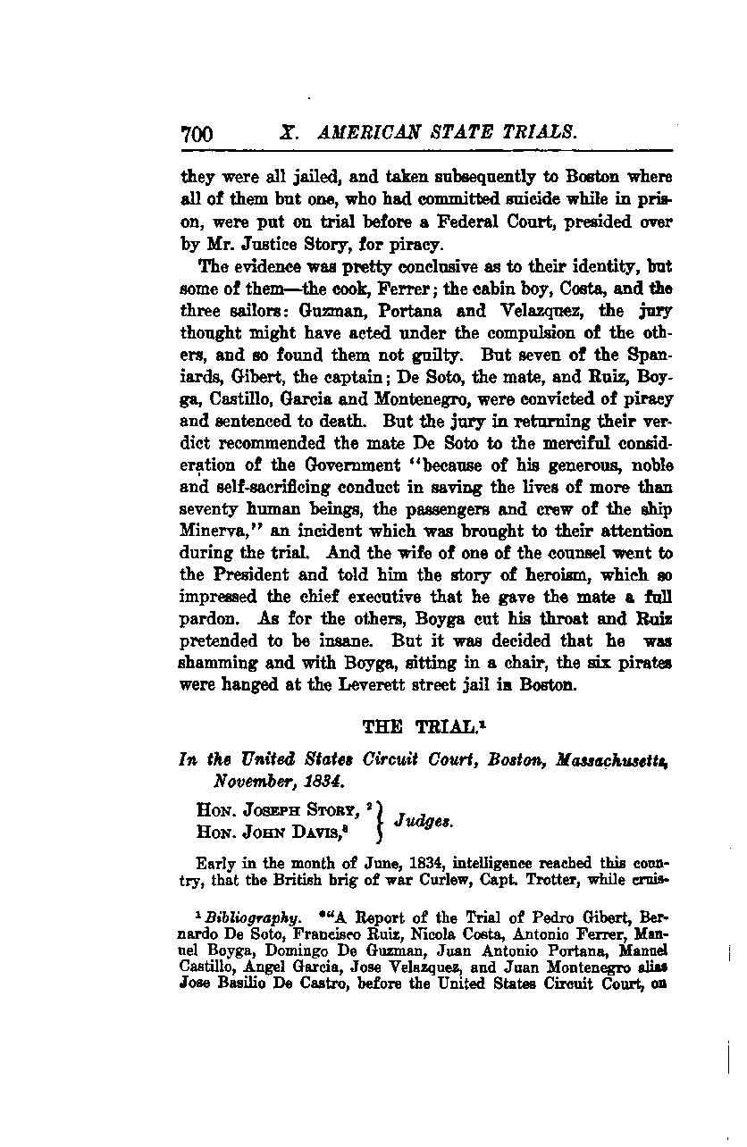 They were all jailed and subsequently taken to Boston, where all of them, except one who had committed suicide while in prison, were put on trial before a Federal Court. The court was presided over by Mr. Justice Story, and the charge was piracy.