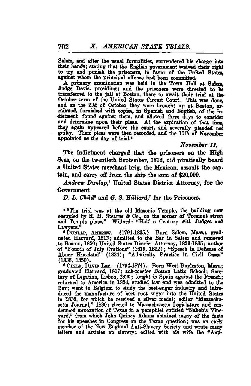 A primary examination was held in the Town Hall at Salem, with Judge Davis presiding. The prisoners were directed to be transferred to the jail in Boston, where they would await their trial at the October term of the United States Circuit Court. This was done, and on the 23rd of October, they were brought up in Boston, arraigned, furnished with copies of the indictment found against them in both Spanish and English, and allowed three days to consider and determine their pleas. At the expiration of that time, they again appeared before the court and each pleaded not guilty. Their pleas were then recorded, and the 11th of November was appointed as the day of trial.