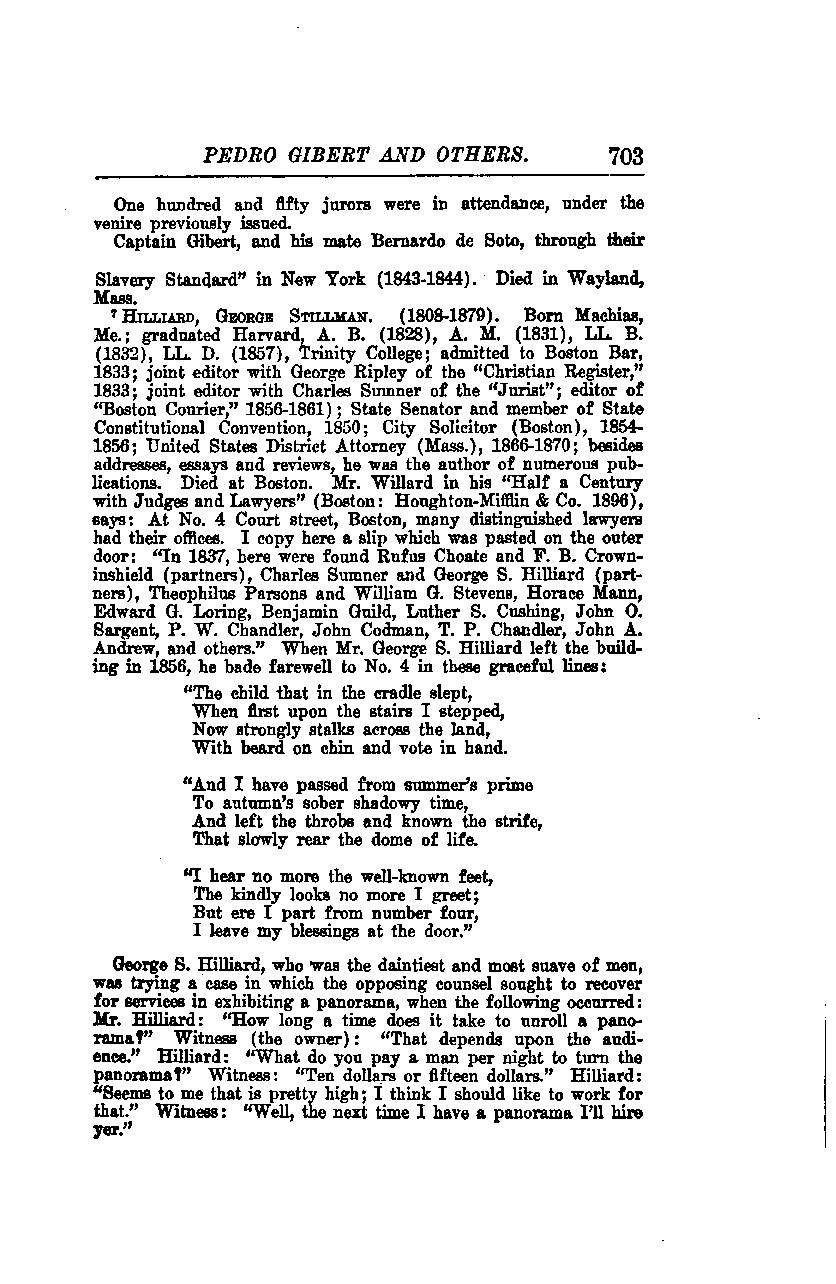 Mr. Willard, in his "Half a Century with Judges and Lawyers" (Boston: Houghton-Mifflin & Co., 1896), says: "At No. 4 Court Street, Boston, many distinguished lawyers had their offices. I copy here a slip which was pasted on the outer door: 'In 1837, here were found Rufus Choate and F. B. Crowninshield (partners), Charles Sumner and George S. Hilliard (partners), Theophilus Parsons and William G. Stevens, Horace Mann, Edward G. Loring, Benjamin Guild, Luther S. Cushing, John O. Sargent, P. W. Chandler, John Codman, T. P. Chandler, John A. Andrew, and others.'"