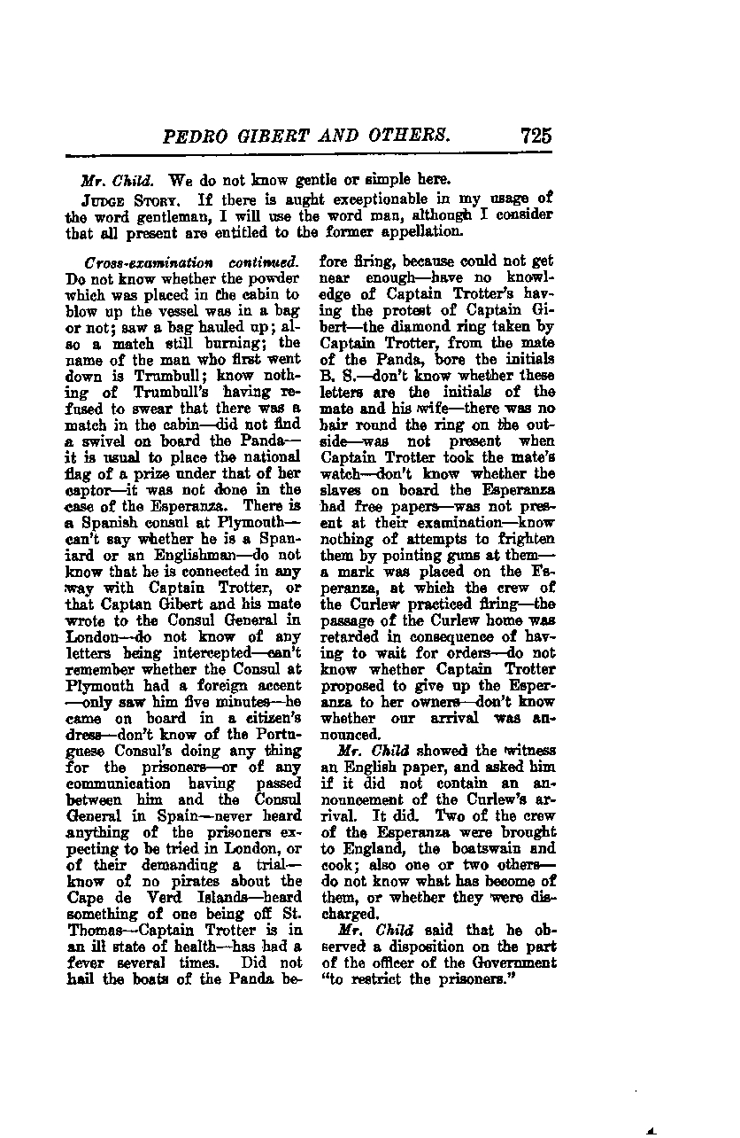 The diamond ring taken by Captain Trotter from the mate of the Panda bore the initials B.S. I don't know whether these letters are the initials of the mate and his wife. There was no hair around the ring on the outside. I was not present when Captain Trotter took the mate’s watch. I don't know whether the slaves on board the Esperanza had free papers, as I was not present at their examination. I know nothing of attempts to frighten them by pointing guns at them.