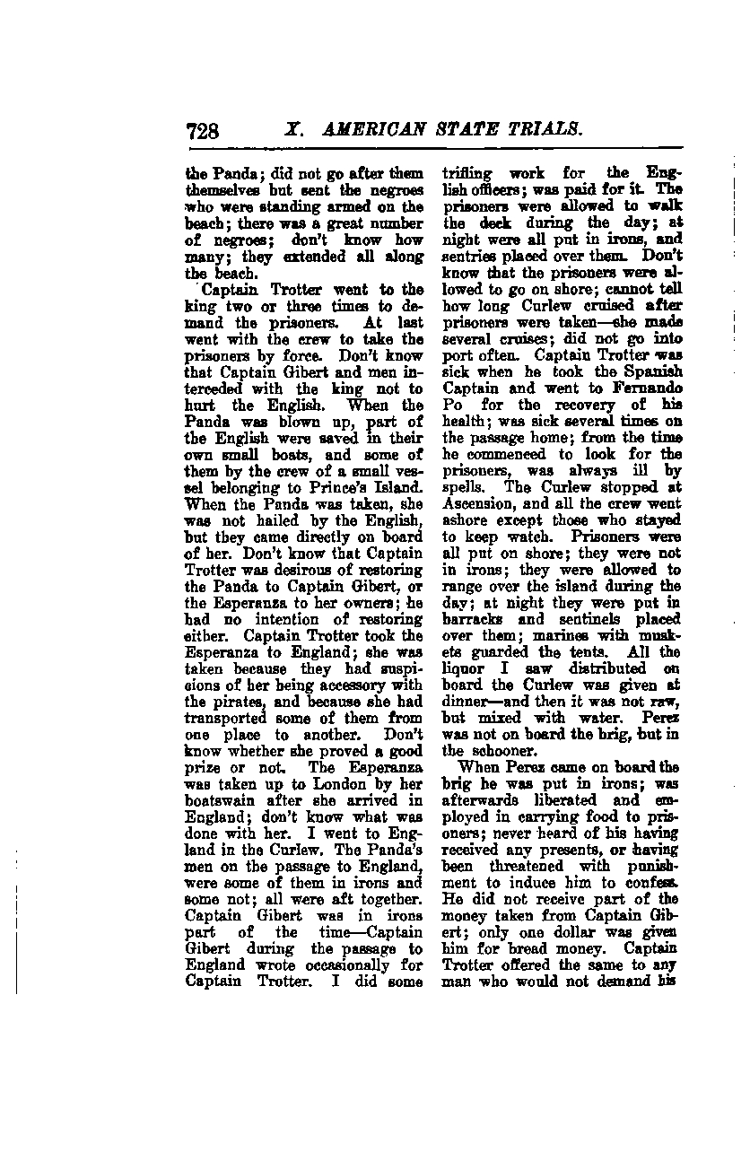 Captain Trotter went to the king two or three times to demand the prisoners. At last, he went with the crew to take the prisoners by force. I don't know if Captain Gibert and his men interceded with the king not to harm the English. When the Panda was blown up, part of the English were saved in their own small boats, and some were rescued by the crew of a small vessel belonging to Prince's Island.