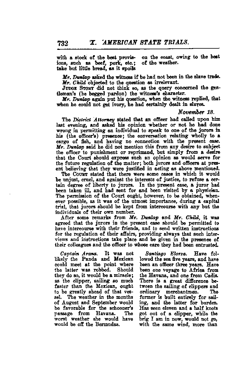 Mr. Dunlap asked the witness if he had not been involved in the slave trade. Mr. Child objected to the question as irrelevant. Judge Story did not think so, as the query concerned the gentleman’s—she begged pardon—the witness's character. Mr. Dunlap again posed his question, to which the witness replied that when he could not get ivory, he had certainly dealt in slaves.