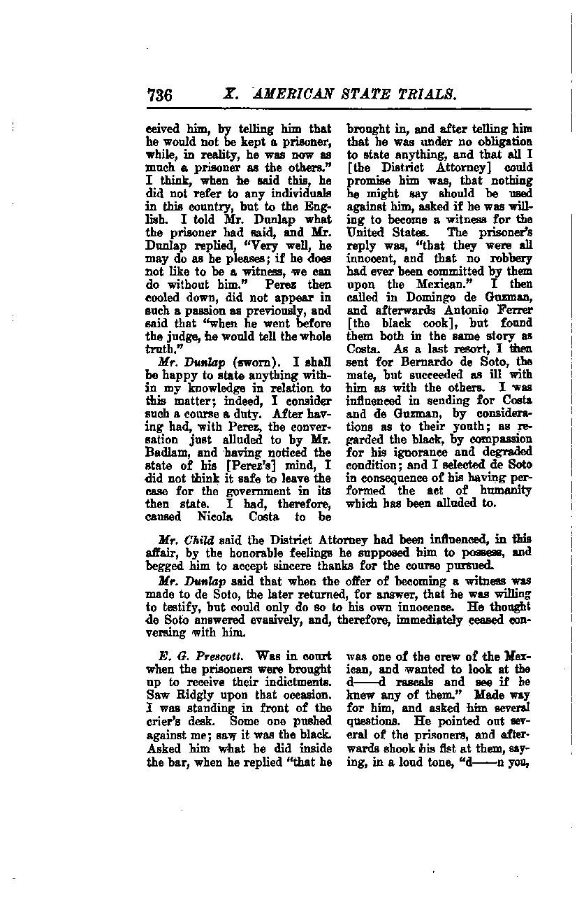 Mr. Dunlap (sworn): I shall be happy to state anything within my knowledge in relation to this matter; indeed, I consider such a course a duty. After having had, with Perez, the conversation just alluded to by Mr. Badlam, and having noticed the state of his [Perez’s] mind, I did not think it safe to leave the case for the government in its then state. I had, therefore, caused Nicola Costa to be brought in, and after telling him that he was under no obligation to state anything, and that all I [the District Attorney] could promise him was that nothing he might say should be used against him, asked if he was willing to become a witness for the United States. The prisoner's reply was that "they were all innocent, and that no robbery had ever been committed by them upon the Mexican."