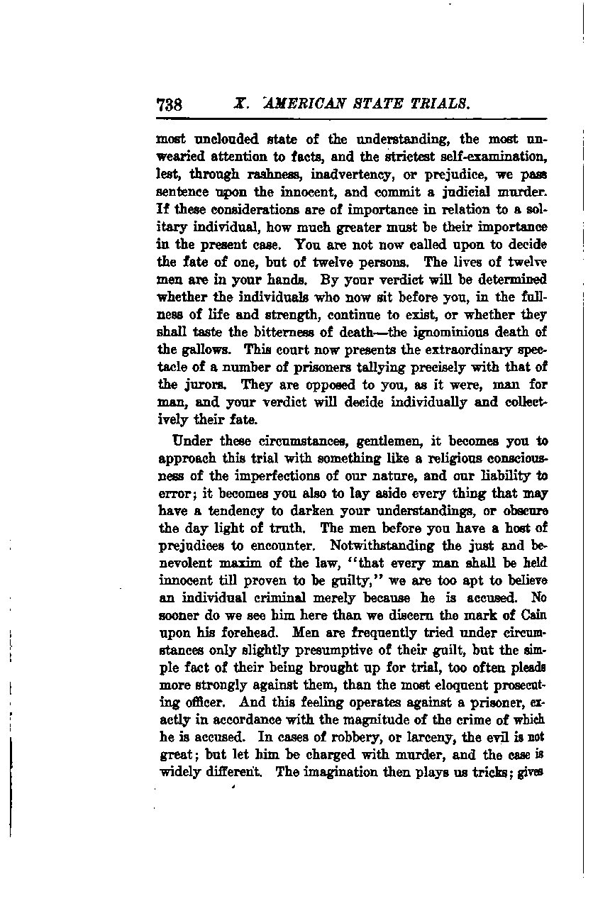 Under these circumstances, gentlemen, it becomes you to approach this trial with something akin to a religious consciousness of the imperfections of our nature and our liability to error. It is also incumbent upon you to lay aside everything that may have a tendency to darken your understanding or obscure the daylight of truth. The men before you have a host of prejudices to encounter. Despite the just and benevolent maxim of the law, "that every man shall be held innocent until proven guilty," we are too apt to believe an individual is criminal merely because he is accused. No sooner do we see him here than we discern the mark of Cain upon his forehead. Men are frequently tried under circumstances only slightly presumptive of their guilt, but the simple fact of their being brought up for trial too often pleads more strongly against them than the most eloquent prosecuting officer. This feeling operates against a prisoner exactly in accordance with the magnitude of the crime of which he is accused. In cases of robbery or larceny, the evil is not great; but let him be charged with murder, and the case is widely different. The imagination then plays tricks on us, giving rise to unwarranted assumptions and biases.