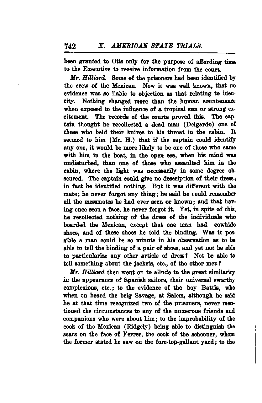 Mr. Hilliard then alluded to the great similarity in the appearance of Spanish sailors, their universally swarthy complexions, etc.; to the evidence of the boy Battis, who, when on board the brig Savage at Salem, claimed he recognized two of the prisoners but never mentioned the circumstances to any of the numerous friends and companions around him; and to the improbability of the cook of the Mexican (Ridgely) being able to distinguish the scars on the face of Ferrer, the cook of the schooner, whom he stated he saw on the fore-top-gallant yard.