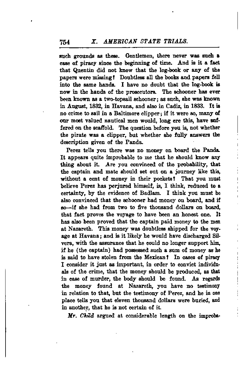 Such grounds as these, gentlemen, have never been seen in a case of piracy since the beginning of time. Is it a fact that Quentin did not know that the logbook or any of the papers were missing? Doubtless, all the books and papers fell into the same hands. I have no doubt that the logbook is now in the hands of the prosecutors. The schooner has always been known as a two-topsail schooner; as such, she was known in August 1832, in Havana, and also in Cadiz in 1833. It is no crime to sail in a Baltimore clipper; if it were, many of our most valued nautical men would have long since suffered on the scaffold. The question before you is not whether the pirate was a clipper, but whether she fully answers the description given of the Panda.