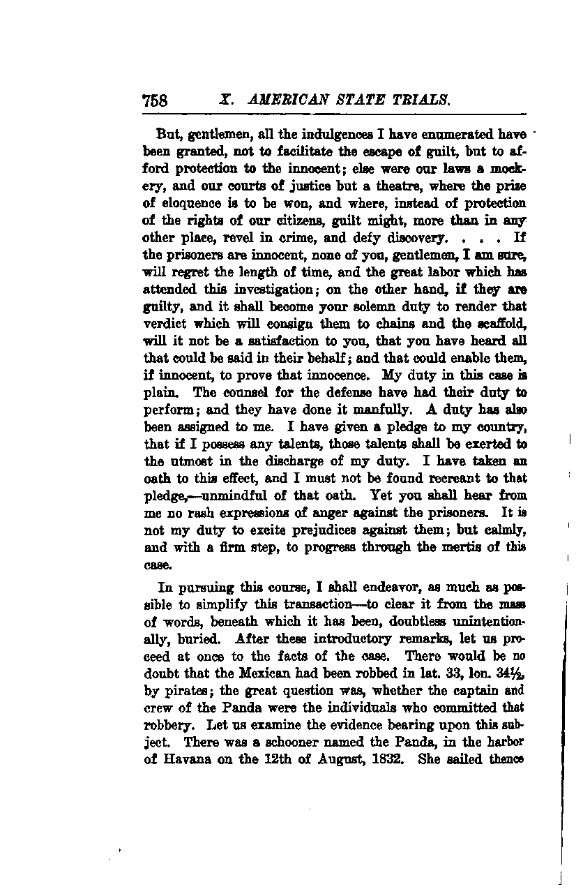 In pursuing this course, I shall endeavor, as much as possible, to simplify this transaction—to clear it from the mass of words beneath which it has been, doubtless unintentionally, buried. After these introductory remarks, let us proceed at once to the facts of the case. There is no doubt that the Mexican had been robbed in latitude 33, longitude 3414, by pirates. The great question was whether the captain and crew of the Panda were the individuals who committed that robbery. Let us examine the evidence bearing upon this subject. There was a schooner named the Panda in the harbor of Havana on the 12th of August, 1832. She sailed thence...