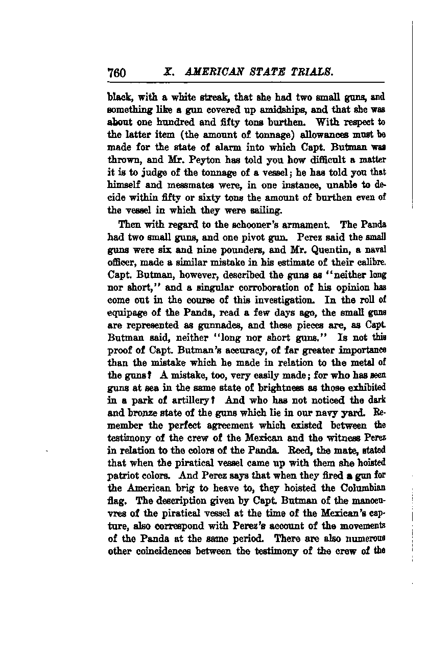 Remember the perfect agreement between the testimony of the crew of the Mexican and the witness Perez regarding the colors of the Panda. Reed, the mate, stated that when the piratical vessel approached them, she hoisted patriot colors. Perez says that when they fired a gun for the American brig to heave to, they hoisted the Colombian flag. The description given by Capt. Butman of the maneuvers of the piratical vessel at the time of the Mexican’s capture also corresponds with Perez’s account of the movements of the Panda during the same period. There are also numerous other coincidences between the testimony of the crew of the Mexican and the witness Perez.
