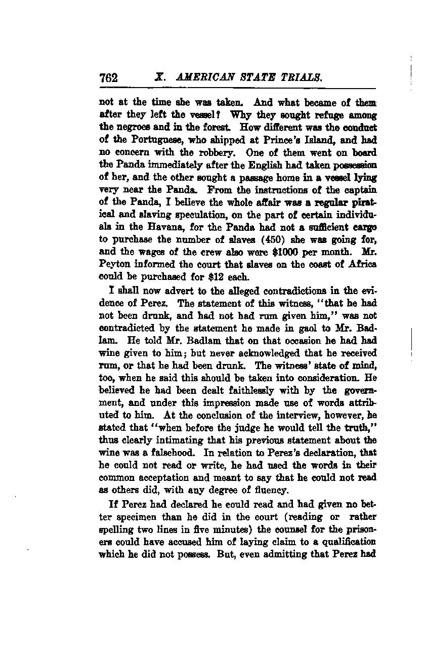 At the time she was taken, what became of them after they left the vessel? They sought refuge among the negroes and in the forest. How different was the conduct of the Portuguese, who shipped at Prince’s Island and had no concern with the robbery. One of them went on board the Panda immediately after the English had taken possession of her, and the other sought a passage home in a vessel lying very near the Panda. From the instructions of the captain of the Panda, I believe the whole affair was a regular piratical and slaving speculation on the part of certain individuals in Havana. The Panda did not have a sufficient cargo to purchase the number of slaves (450) she was going for, and the wages of the crew were $1000 per month. Mr. Peyton informed the court that slaves on the coast of Africa could be purchased for $12 each.