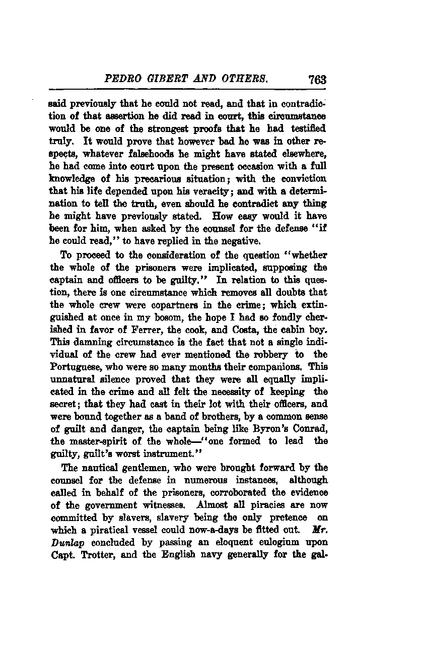 The nautical gentlemen, who were brought forward by the counsel for the defense in numerous instances, although called on behalf of the prisoners, corroborated the evidence of the government witnesses. Almost all piracies are now committed by slavers, slavery being the only pretense on which a piratical vessel could nowadays be fitted out. Mr. Dunlap concluded by delivering an eloquent eulogy upon Capt. Trotter and the English navy generally for their gallantry.
