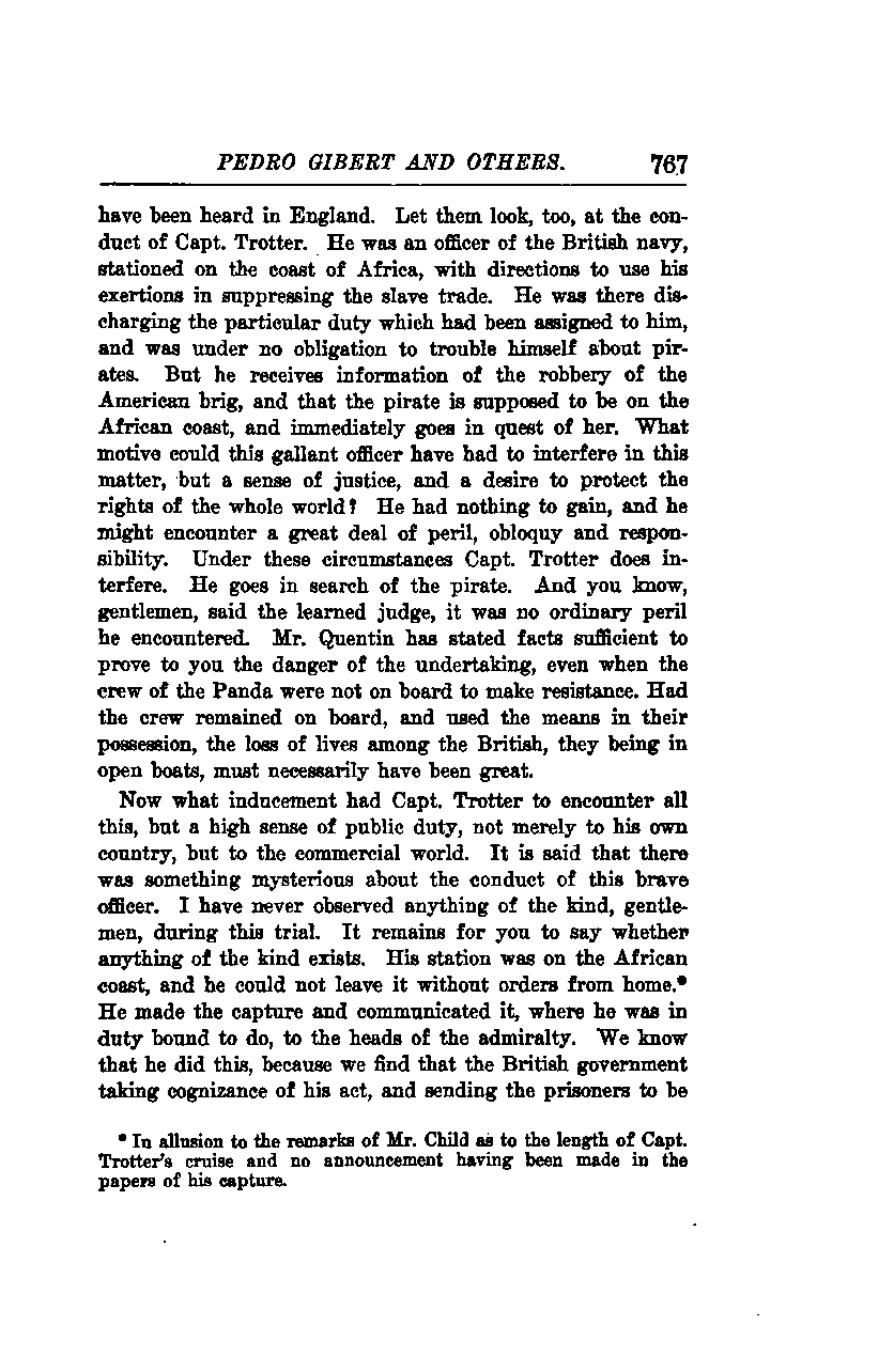 Now, what inducement had Capt. Trotter to encounter all this but a high sense of public duty, not merely to his own country but to the commercial world? It is said that there was something mysterious about the conduct of this brave officer. I have never observed anything of the kind, gentlemen, during this trial. It remains for you to say whether anything of the kind exists. His station was on the African coast, and he could not leave it without orders from home. He made the capture and communicated it, as he was duty-bound to do, to the heads of the admiralty. We know that he did this because we find the British government taking cognizance of his act and sending the prisoners to be tried.
