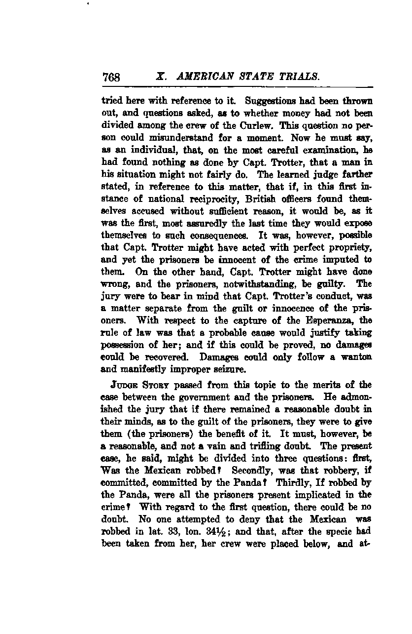 The trial here was conducted with reference to certain suggestions and questions regarding whether money had been divided among the crew of the Curlew. This question was clear and understandable to everyone. As an individual, after the most careful examination, I must say that I found nothing in Captain Trotter's actions that a man in his position might not fairly do. The learned judge further stated, in reference to this matter, that if, in this first instance of national reciprocity, British officers found themselves accused without sufficient reason, it would be, as it was the first, most assuredly the last time they would expose themselves to such consequences.