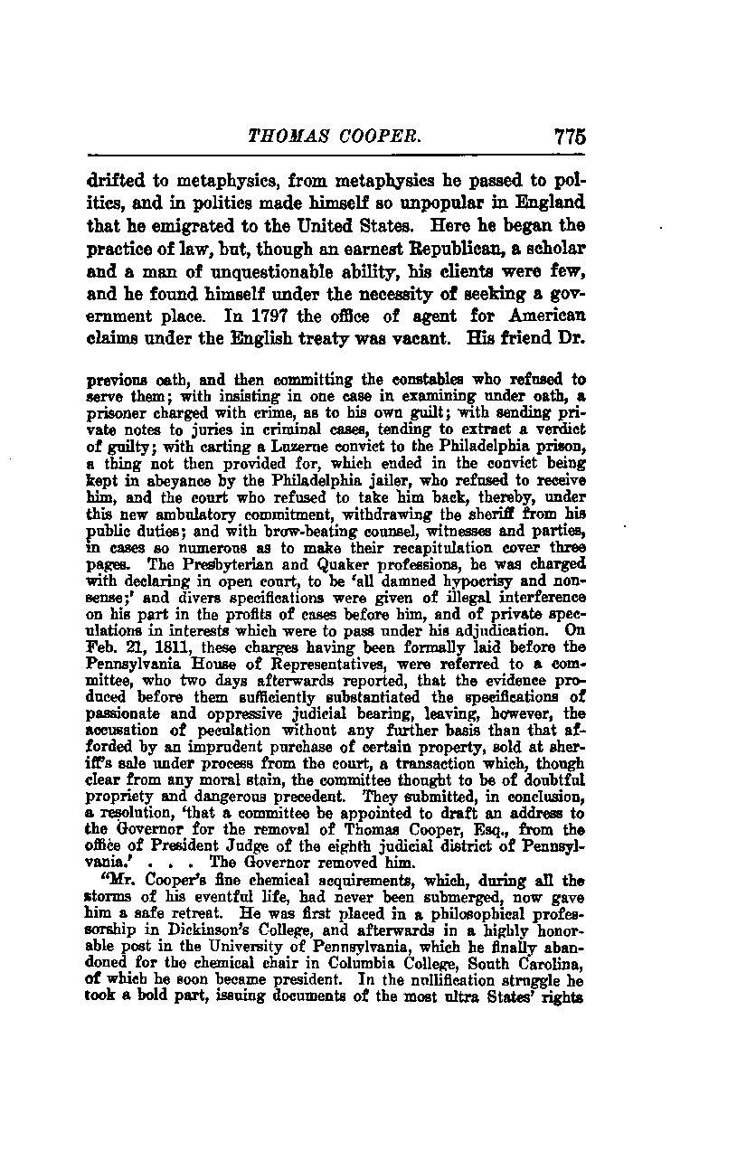 Thomas Cooper drifted into metaphysics, and from metaphysics, he transitioned to politics. In politics, he became so unpopular in England that he emigrated to the United States. Here, he began practicing law. Despite being an earnest Republican, a scholar, and a man of unquestionable ability, his clients were few. Consequently, he found himself needing to seek a government position. In 1797, the office of agent for American claims under the English treaty became vacant. His friend, Dr.