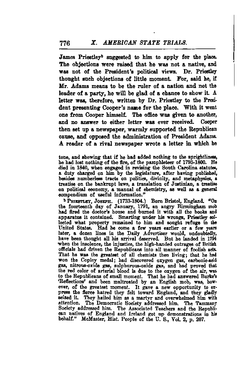 Joseph Priestley (1733-1804) was born in Bristol, England. On January 14, 1791, an angry Birmingham mob set fire to his house, destroying it along with all his books and apparatus. Smarting from his losses, Priestley gathered what property remained and sought refuge in the United States. Had he arrived a few years earlier or later, a brief mention in the Daily Advertiser would likely have sufficed. However, he landed in 1794, a time when the arrogance, injustice, and high-handed actions of British officials had driven the Republicans to various imprudent acts. That he was the greatest chemist of his time, had won the Copley Medal, discovered oxygen gas, carbonic acid gas, nitrous oxide gas, and sulfurous oxide gas, and proved that the red color of arterial blood is due to the oxygen in the air, was of little importance to the Republicans. What mattered greatly was that he had responded to Burke's "Reflections" and had been mistreated by an English mob. This provided a new opportunity to express their intense hatred toward England, which they eagerly seized. They hailed him as a martyr and showered him with attention. The Democratic Society addressed him, as did the Tammany Society. The Associated Teachers and the Republican natives of England and Ireland organized demonstrations in his honor. (McMaster, "History of the People of the U.S.," Vol. 2, p. 207.)