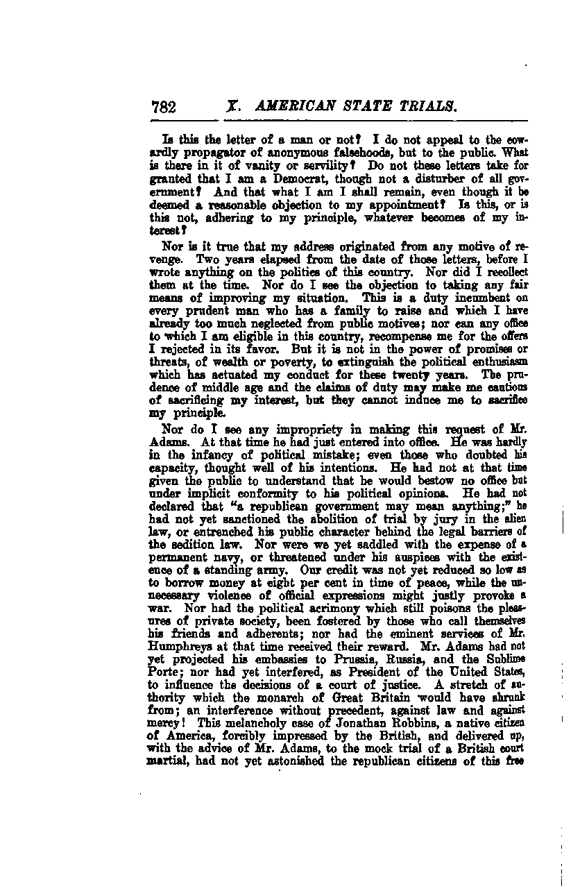 Nor had the political acrimony which still poisons the pleasures of private society been fostered by those who call themselves his friends and adherents; nor had the eminent services of Mr. Humphreys at that time received their reward. Mr. Adams had not yet projected his embassies to Prussia, Russia, and the Sublime Porte; nor had he yet interfered, as President of the United States, to influence the decisions of a court of justice. A stretch of authority which the monarch of Great Britain would have shrunk from; an interference without precedent, against law and against mercy! This melancholy case of Jonathan Robbins, a native citizen of America, forcibly impressed by the British and delivered up, with the advice of Mr. Adams, to the mock trial of a British court martial, had not yet astonished the republican citizens of this free nation.