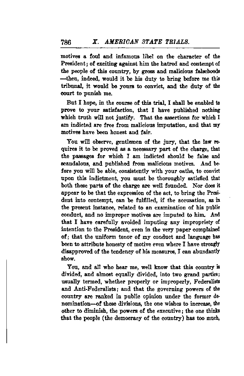 Gentlemen of the jury, you will observe that the law requires it to be proven as a necessary part of the charge that the passages for which I am indicted should be false and scandalous, and published with malicious motives. Before you can, consistently with your oaths, convict me on this indictment, you must be thoroughly satisfied that both these parts of the charge are well-founded.