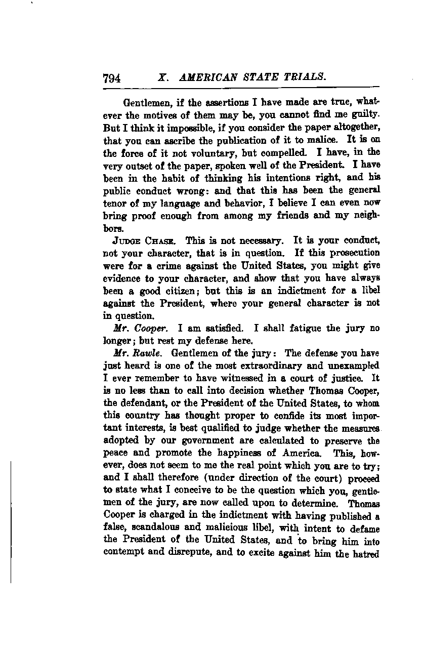 Mr. Rawle: Gentlemen of the jury, the defense you have just heard is one of the most extraordinary and unexampled I have ever witnessed in a court of justice. It is no less than a decision on whether Thomas Cooper, the defendant, or the President of the United States, to whom this country has entrusted its most important interests, is best qualified to judge whether the measures adopted by our government are calculated to preserve the peace and promote the happiness of America. However, this does not seem to me the real point you are to try. Therefore, under the direction of the court, I will proceed to state what I conceive to be the question you, gentlemen of the jury, are now called upon to determine. Thomas Cooper is charged in the indictment with having published a false, scandalous, and malicious libel, with the intent to defame the President of the United States, to bring him into contempt and disrepute, and to incite hatred against him.