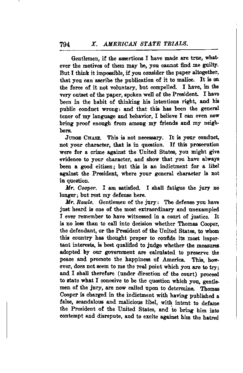 Mr. Rawle: Gentlemen of the jury, the defense you have just heard is one of the most extraordinary and unexampled I have ever witnessed in a court of justice. It is no less than a call to decide whether Thomas Cooper, the defendant, or the President of the United States, to whom this country has entrusted its most important interests, is better qualified to judge whether the measures adopted by our government are calculated to preserve the peace and promote the happiness of America. However, this does not seem to me the real point you are to try. I shall therefore, under the direction of the court, proceed to state what I conceive to be the question you, gentlemen of the jury, are now called upon to determine. Thomas Cooper is charged in the indictment with having published a false, scandalous, and malicious libel, with the intent to defame the President of the United States, to bring him into contempt and disrepute, and to incite hatred against him.