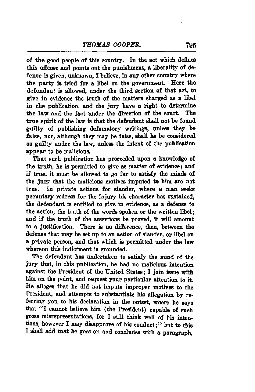 The defendant has undertaken to convince the jury that, in this publication, he harbored no malicious intent against the President of the United States. I join issue with him on this point and request your particular attention to it. He alleges that he did not attribute improper motives to the President and attempts to substantiate his claim by referring to his initial declaration, where he states, "I cannot believe him (the President) capable of such gross misrepresentations, for I still think well of his intentions, however I may disapprove of his conduct." However, I must add that he continues and concludes with a paragraph...