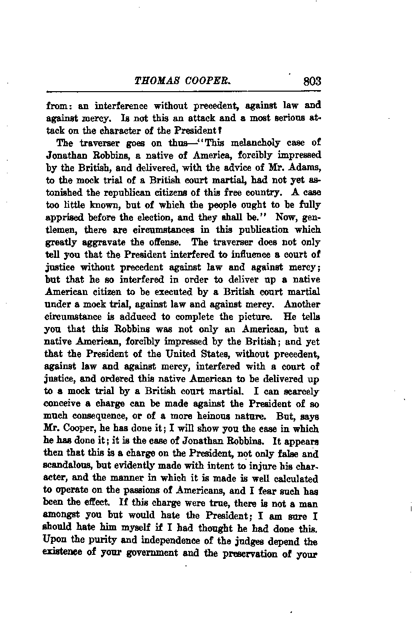 Another circumstance is adduced to complete the picture. He tells you that this Robbins was not only an American but a native American, forcibly impressed by the British; and yet that the President of the United States, without precedent, against law and against mercy, interfered with a court of justice, and ordered this native American to be delivered up to a mock trial by a British court martial. I can scarcely conceive a charge can be made against the President of so much consequence or of a more heinous nature.