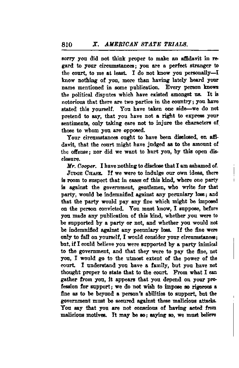 Judge Chase: If we were to indulge our own ideas, there is room to suspect that in cases of this kind, where one party is against the government, gentlemen who write for that party would be indemnified against any pecuniary loss, and that the party would pay any fine imposed on the person convicted. You must have known, I suppose, before you made any publication of this kind, whether you were to be supported by a party or not, and whether you would be indemnified against any pecuniary loss. If the fine were only to fall on yourself, I would consider your circumstances. However, if I could believe you were supported by a party inimical to the government, and that they were to pay the fine, not you, I would go to the utmost extent of the court's power.