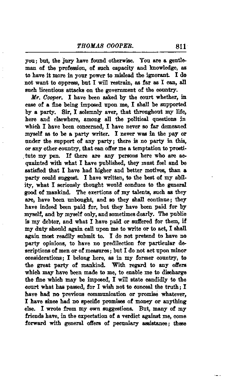 Mr. Cooper, I have been asked by the court whether, in the case of a fine being imposed upon me, I shall be supported by a party. Sir, I solemnly aver that throughout my life, here and elsewhere, among all the political questions in which I have been involved, I have never demeaned myself to be a party writer. I have never been in the pay or under the support of any party; there is no party in this or any other country that can offer me a temptation to prostitute my pen.