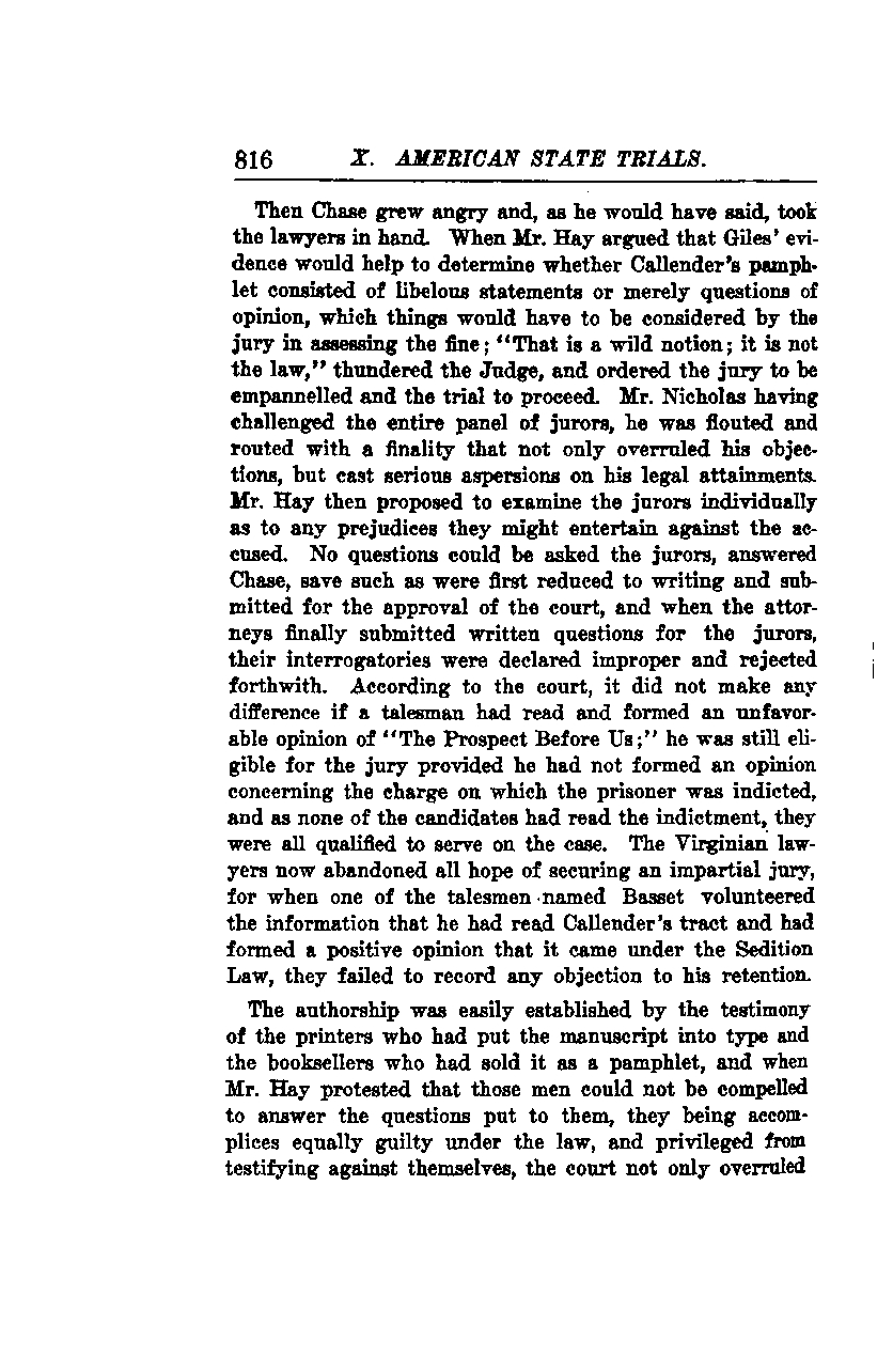 Then Chase grew angry and, as he would have said, took the lawyers in hand. When Mr. Hay argued that Giles' evidence would help determine whether Callender's pamphlet consisted of libelous statements or merely questions of opinion—matters that the jury would need to consider when assessing the fine—Chase thundered, "That is a wild notion; it is not the law," and ordered the jury to be empaneled and the trial to proceed.