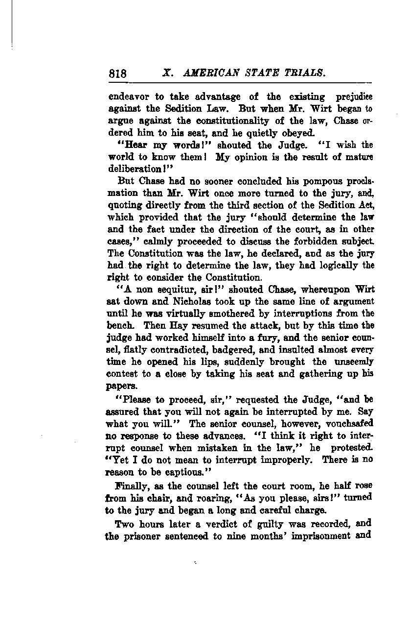 No sooner had Chase concluded his pompous proclamation than Mr. Wirt once more turned to the jury. Quoting directly from the third section of the Sedition Act, which provided that the jury "should determine the law and the fact under the direction of the court, as in other cases," he calmly proceeded to discuss the forbidden subject. He declared that the Constitution was the law, and as the jury had the right to determine the law, they logically had the right to consider the Constitution.
