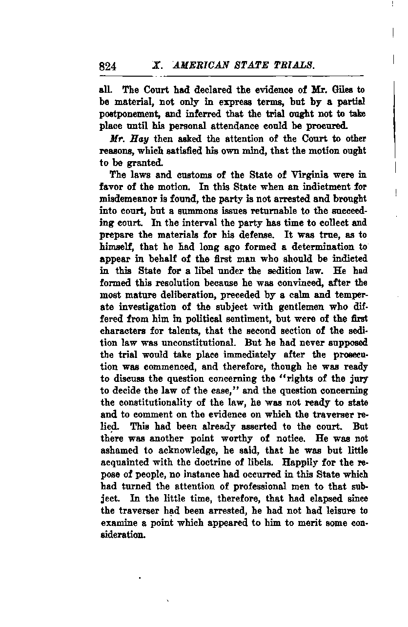 Mr. Hay noted that he had long ago resolved to represent the first person indicted in this state for a libel under the sedition law. He made this decision after careful deliberation and a calm, thorough investigation of the subject with gentlemen who held differing political views but were highly talented. He concluded that the second section of the sedition law was unconstitutional. However, he never anticipated that the trial would occur immediately after the prosecution began. Consequently, while he was prepared to discuss the "rights of the jury to decide the law of the case" and the constitutionality of the law, he was not ready to present and comment on the evidence the defendant relied upon. This had already been communicated to the court.