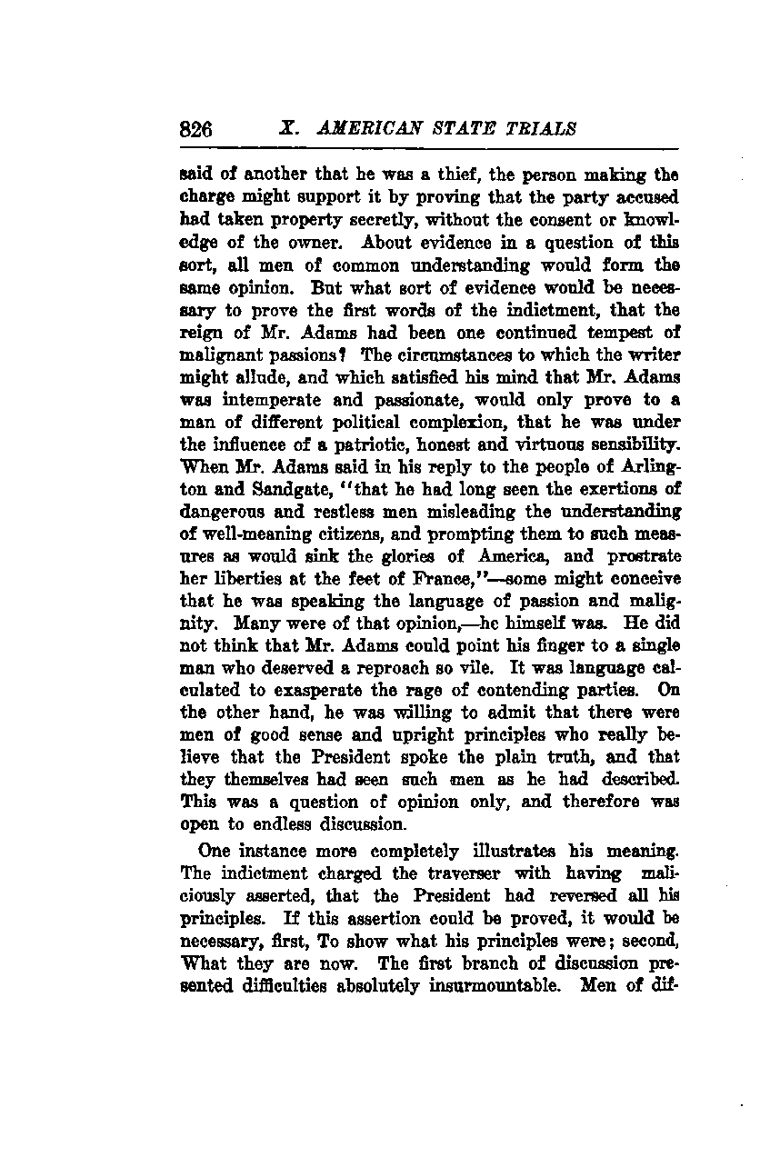 One more instance completely illustrates his meaning. The indictment charged the defendant with having maliciously asserted that the President had reversed all his principles. If this assertion could be proven, it would be necessary, first, to show what his principles were; second, what they are now. The first branch of discussion presented difficulties that were absolutely insurmountable. Men of different perspectives would undoubtedly have varied interpretations of what constituted the President's principles.