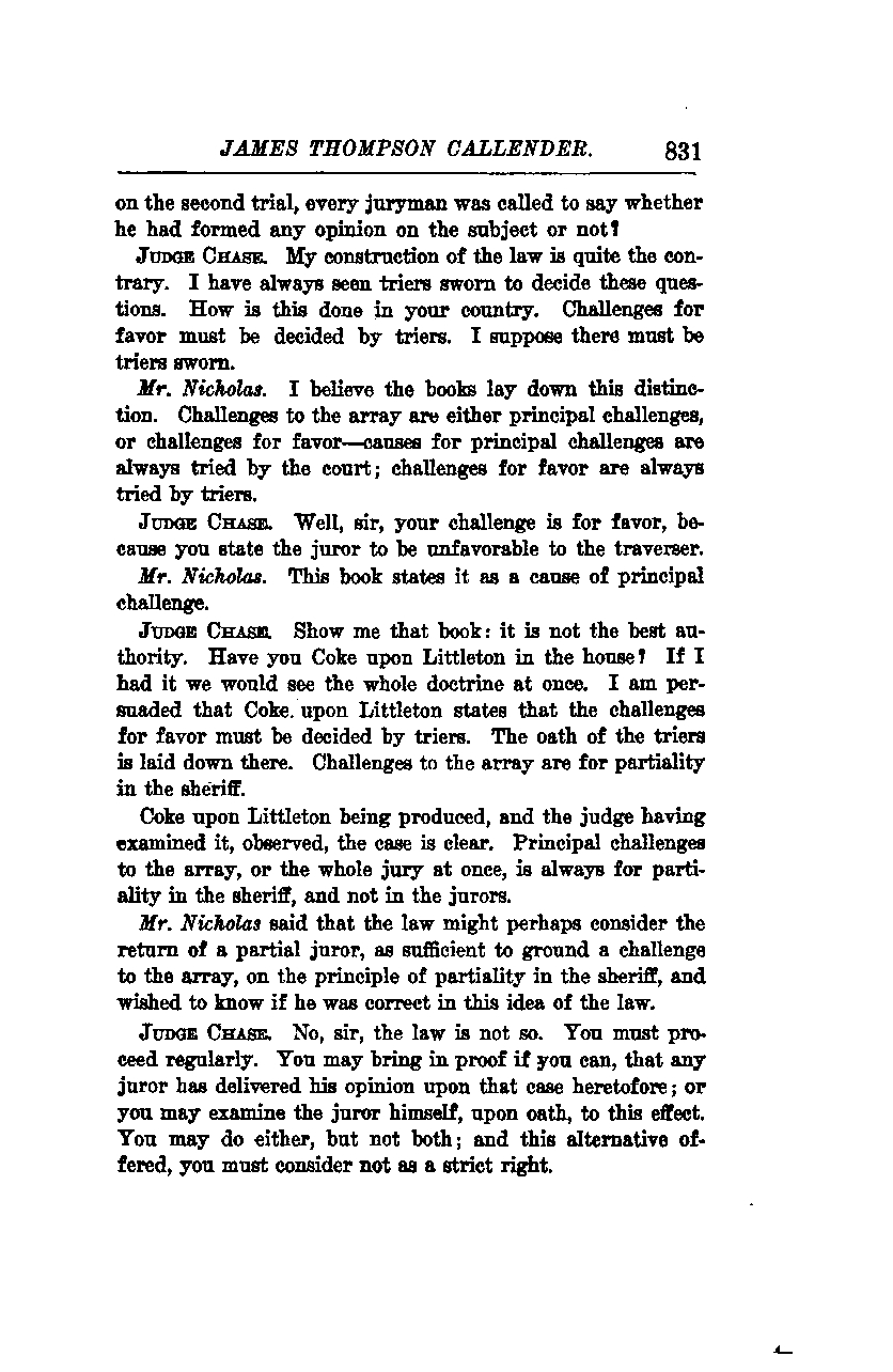 Judge Chase: Show me that book; it is not the best authority. Do you have Coke upon Littleton in the house? If I had it, we would see the whole doctrine at once. I am persuaded that Coke upon Littleton states that the challenges for favor must be decided by triers. The oath of the triers is laid down there. Challenges to the array are for partiality in the sheriff.