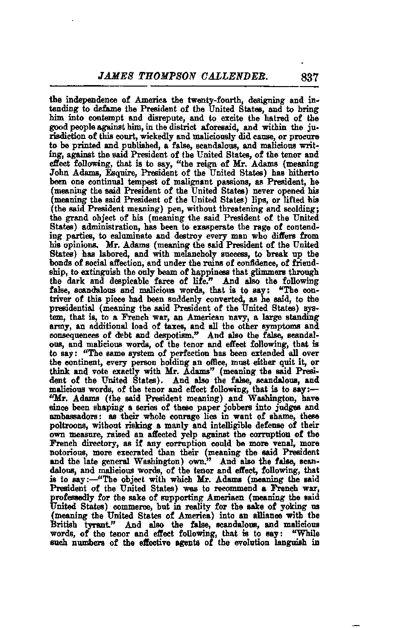 "The reign of Mr. Adams (meaning John Adams, Esquire, President of the United States) has hitherto been one continual tempest of malignant passions. As President, he (meaning the said President of the United States) never opened his lips or lifted his pen without threatening and scolding. The grand object of his administration has been to exasperate the rage of contending parties, to calumniate and destroy every man who differs from his opinions. Mr. Adams has labored, and with melancholy success, to break up the bonds of social affection and, under the ruins of confidence and friendship, to extinguish the only beam of happiness that glimmers through the dark and despicable farce of life."