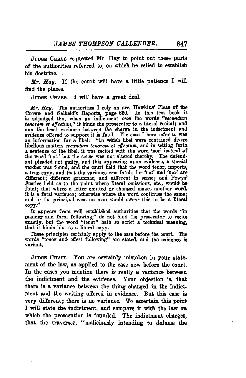 Mr. Hay continued, "The authorities I rely on are Hawkins’ Pleas of the Crown and Salkeld’s Reports, page 660. In this last book, it is adjudged that when an indictment uses the words 'secundum tenorem et effectum,' it binds the prosecutor to a literal recital; and any the least variance between the charge in the indictment and the evidence offered to support it is fatal. The case I refer to was an information for a libel: 'In which libel were contained divers libellous matters secundum tenorem et effectum,' and in setting forth a sentence of the libel, it was recited with the word 'nor' instead of the word 'not,' but the sense was not altered thereby. The defendant pleaded not guilty, and this appearing upon evidence, a special verdict was found. The court held that the word 'tenor' imports a true copy, and that the variance was fatal; for 'not' and 'nor' are different—different grammar, and different in sense. Powys’ Justice held as to the point where literal omissions, etc., would be fatal; that where a letter omitted or changed makes another word, it is a fatal variance; otherwise, where the word continues the same. In the principal case, no man would swear this to be a literal copy."