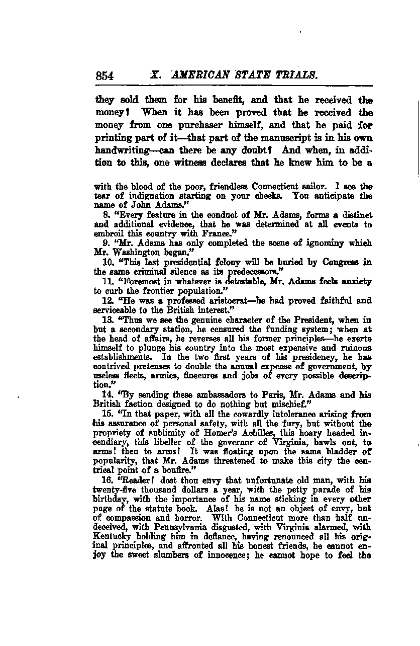 They sold them for his benefit, and he received the money. When it has been proven that he received the money from one purchaser himself and that he paid for printing part of it—that part of the manuscript is in his own handwriting—can there be any doubt? In addition to this, one witness declares that he knew him to be involved with the blood of the poor, friendless Connecticut sailor. I see the tear of indignation starting on your cheeks. You anticipate the name of John Adams.