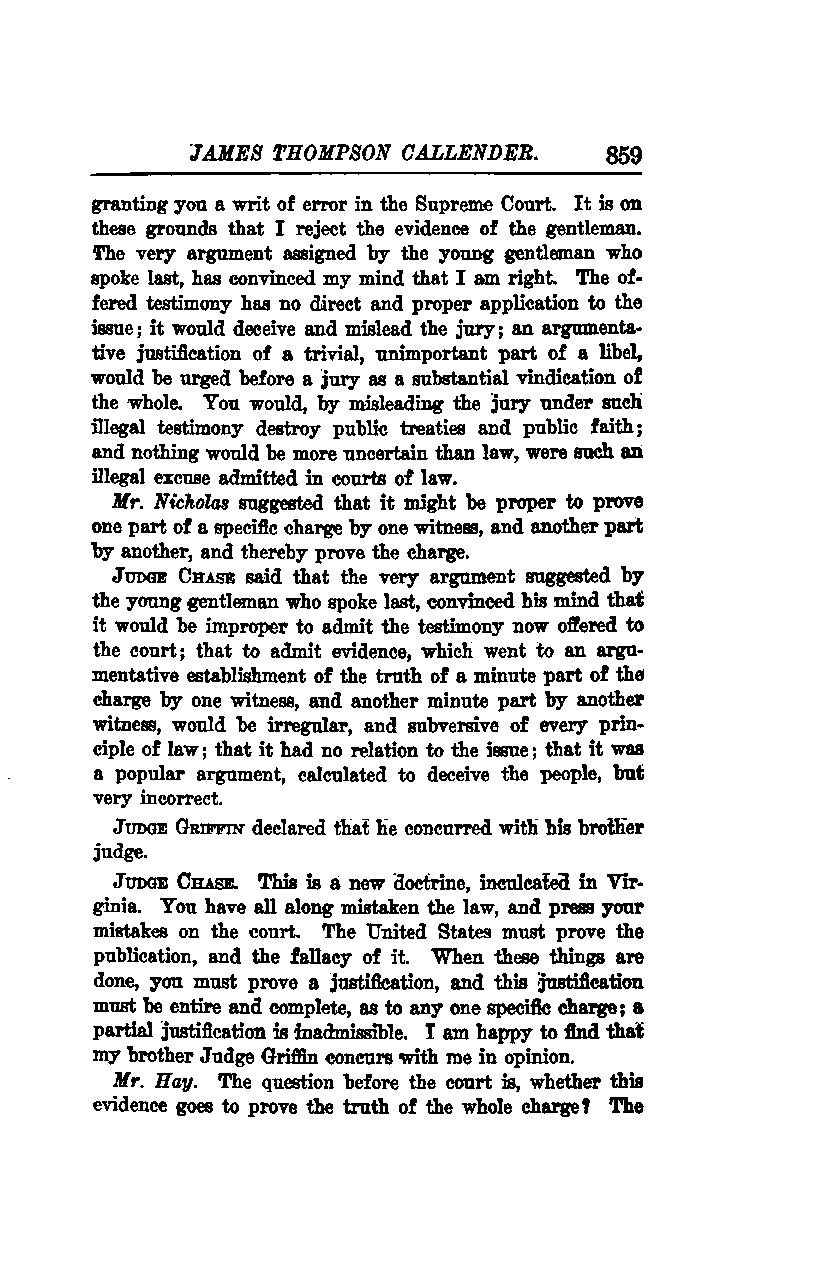 Judge Chase: This is a new doctrine, inculcated in Virginia. You have all along mistaken the law and press your mistakes on the court. The United States must prove the publication and the fallacy of it. When these things are done, you must prove a justification, and this justification must be entire and complete as to any one specific charge; a partial justification is inadmissible. I am happy to find that my brother Judge Griffin concurs with me in opinion.