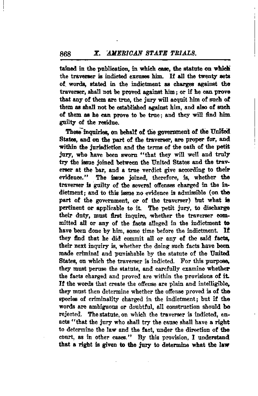 In the case of American State Trials, the statute under which the defendant, referred to as the traverser, is indicted provides an excuse if the allegations contained in the publication are proven true. If not all of the twenty sets of words stated in the indictment as charges against the traverser are proven, or if the traverser can prove any of them to be true, the jury will acquit him of those charges not established against him, as well as those he can prove to be true. The jury will then find him guilty of the remaining charges.