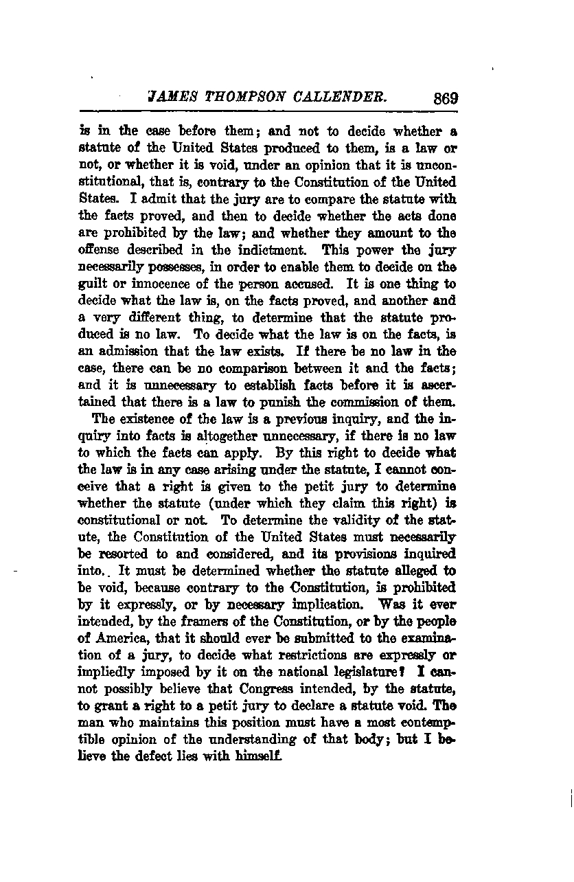 Was it ever intended by the framers of the Constitution, or by the people of America, that it should be submitted to a jury to decide what restrictions are expressly or impliedly imposed by it on the national legislature? I cannot possibly believe that Congress intended, by the statute, to grant a right to a petit jury to declare a statute void. The person who maintains this position must have a very low opinion of the understanding of that body; however, I believe the defect lies with the individual making such a claim.