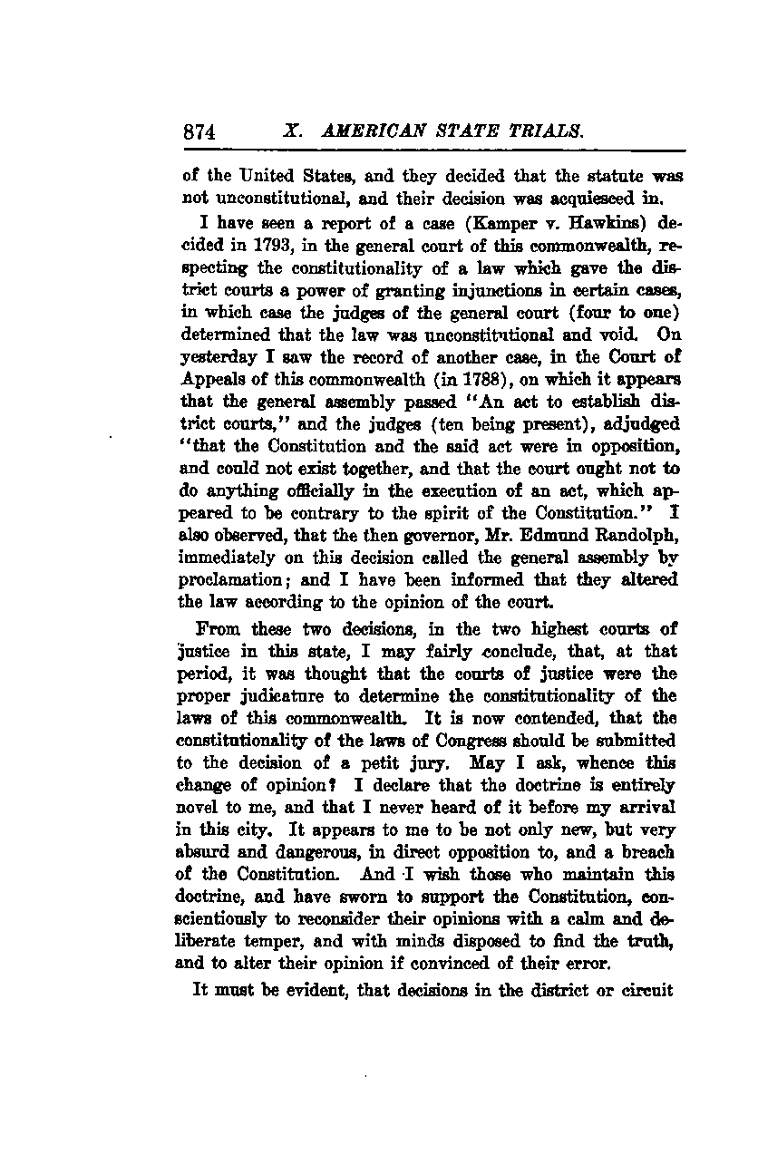 From these two decisions in the highest courts of justice in this state, I can reasonably conclude that, at that time, it was believed that the courts of justice were the appropriate bodies to determine the constitutionality of the laws of this commonwealth. It is now argued that the constitutionality of the laws of Congress should be submitted to the decision of a petit jury. May I ask, what has prompted this change of opinion? I must declare that this doctrine is entirely novel to me, and I had never encountered it before arriving in this city. It seems not only new but also very absurd and dangerous, directly opposing and breaching the Constitution. I urge those who uphold this doctrine and have sworn to support the Constitution to conscientiously reconsider their opinions with a calm and deliberate mindset, open to discovering the truth and willing to change their stance if they find themselves in error.