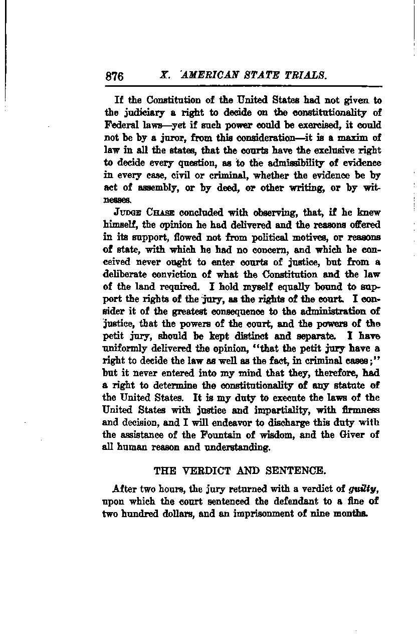 Judge Chase concluded by observing that, if he knew himself, the opinion he had delivered and the reasons offered in its support flowed not from political motives or reasons of state, with which he had no concern and which he believed should never enter courts of justice, but from a deliberate conviction of what the Constitution and the law of the land required. He stated, "I hold myself equally bound to support the rights of the jury as the rights of the court. I consider it of the greatest consequence to the administration of justice that the powers of the court and the powers of the petit jury should be kept distinct and separate. I have uniformly delivered the opinion that the petit jury has a right to decide the law as well as the fact in criminal cases; but it never entered my mind that they, therefore, had a right to determine the constitutionality of any statute of the United States. It is my duty to execute the laws of the United States with justice and impartiality, with firmness and decision, and I will endeavor to discharge this duty with the assistance of the Fountain of wisdom and the Giver of all human reason and understanding."