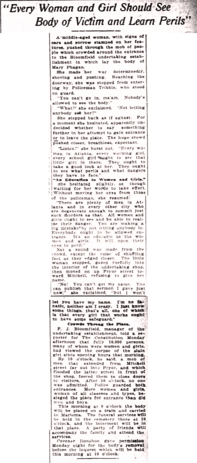 P. J. Bloomfield, manager of the undertaking establishment told a reporter for The Constitution Monday afternoon that fully 10,000 persons, many of whom were women and girls, had viewed the corpse of the slain girl since opening hours that morning.