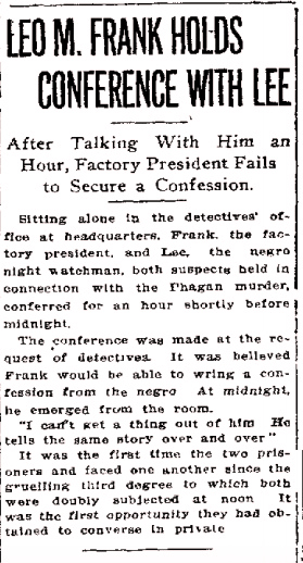 Sitting alone in the detectives' office at headquarters, Frank, the factory president, and Lee, the negro night watchman, both suspects held in connection with the Phagan murder, conferred for an hour shortly before midnight.