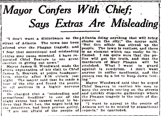 "I don't want a disturbance on the street of Atlanta. The town has been stirred over the Phagan tragedy, and I fear that sensational and misleading extras may cause mischief. I have requested Chief Beavers to use great caution in giving out news."