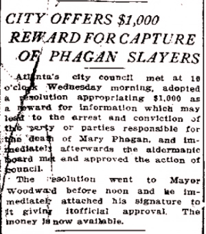 Atlanta's city council met at 10 o'clock Wednesday morning, adopted a resolution appropriating $1,000 as a reward for information which may lead to the arrest and conviction of the party or parties responsible for the death of Mary Phagan, and immediately afterwards the aldermanic board met and approved the action of council.